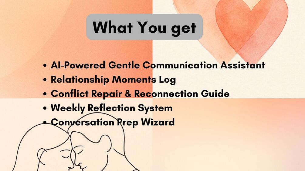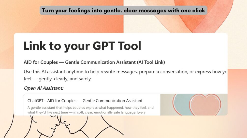 A toolkit to help couples communicate gently and clearly. Capture moments, prepare conversations, repair after conflict, reflect weekly, and turn emotions into soft, supportive messages using the AID method + AI.